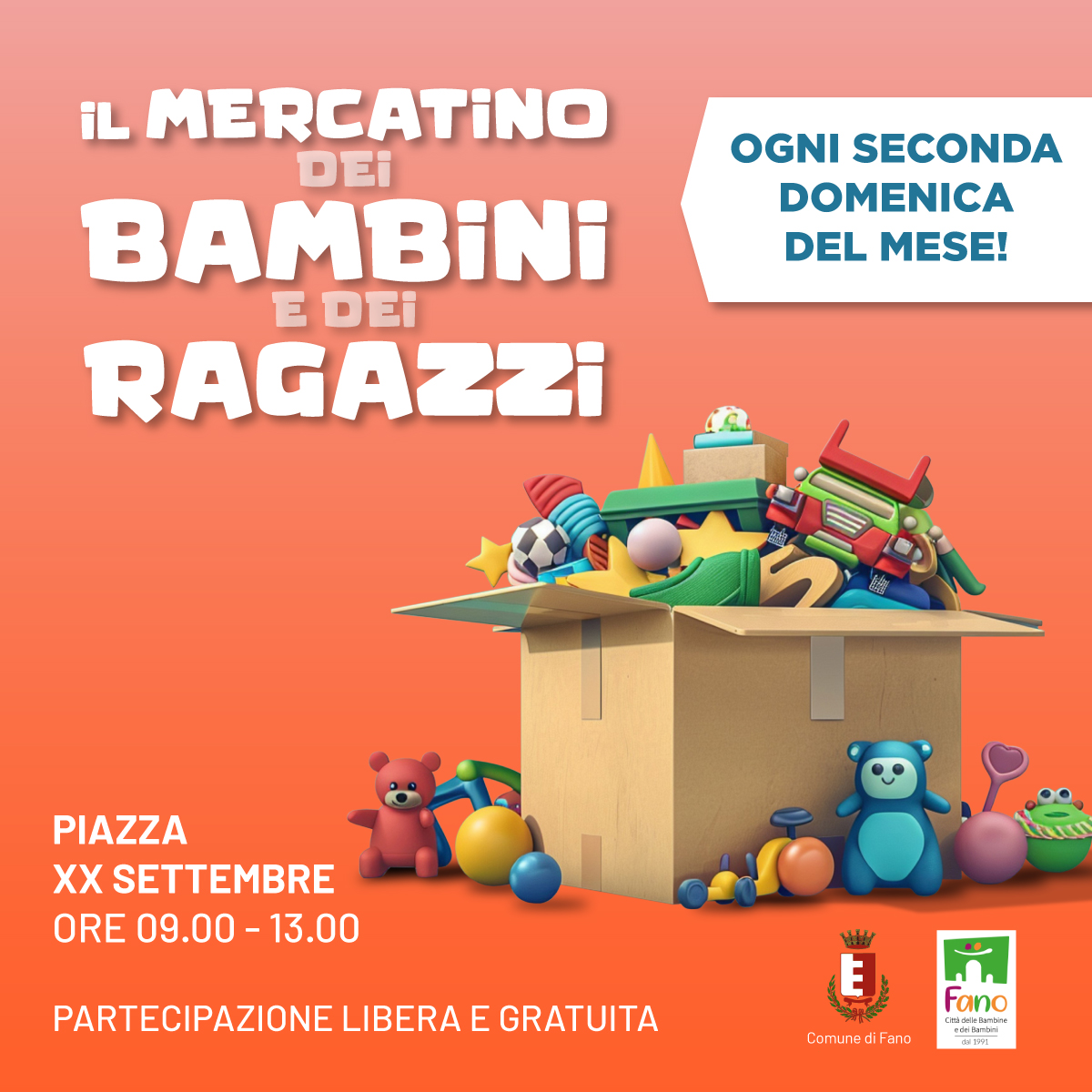 Preparate i vostri tesori! A grande richiesta, torna il Mercatino dei Bambini e dei Ragazzi e, novità entusiasmante, diventa un appuntamento fisso in città! Un’occasione imperdibile per condividere, barattare, riusare e dare una seconda vita ai vostri oggetti più cari. Il Mercatino si svolgerà ogni seconda domenica del mese in PIAZZA XX SETTEMBRE, dalle ore […]